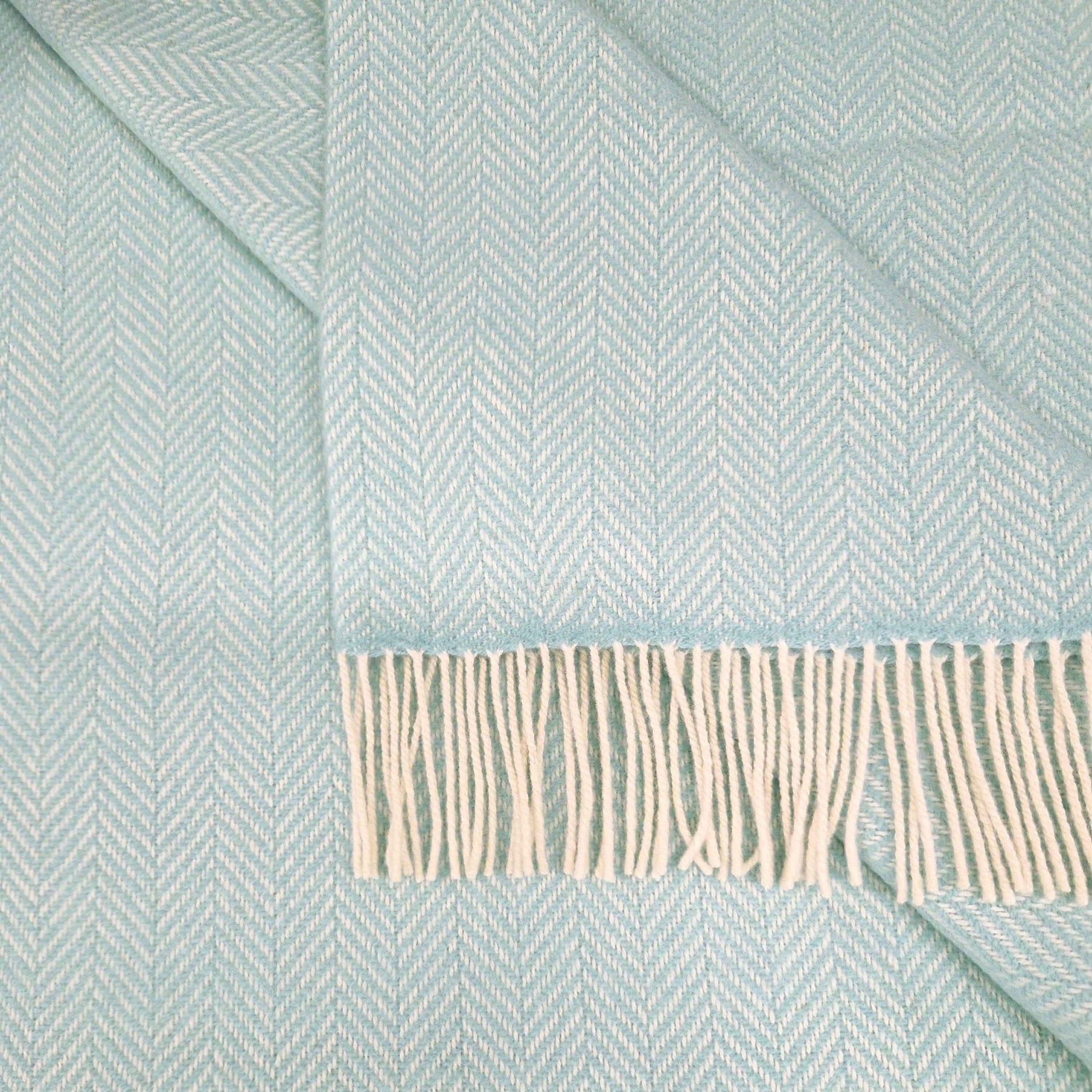 Cashmere Throw WhiteMint Herringbone. Made with a blend of Cashmere and Merino wool. A truly soft and luxurious throw with a vibrant colour palette across the collection.